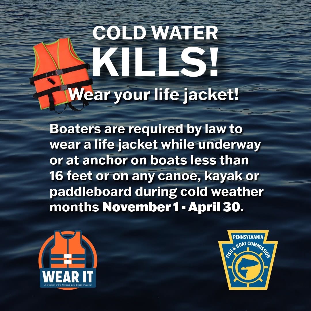 The Pennsylvania Fish and Boat Commission (PFBC) reminds boaters, anglers and hunters that the annual cold weather life jacket requirement is in effect.