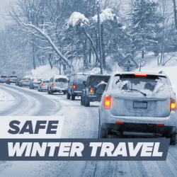 Try to avoid traveling in severe winter weather, but if you have to go, bring a winter emergency travel kit, including a blanket and warm clothes, jumper cables, small shovel, first aid kit, medications for you and your passengers, and water and nonperishable food. A full list of suggested items is available here.
