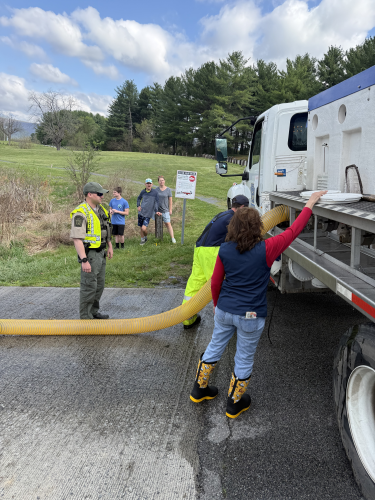 Last week, my staff and I had the opportunity to roll up our sleeves and spend the morning at the Huntsdale State Fish Hatchery, lending a hand as Pennsylvania’s trout season continues in full swing. Our team assisted hatchery staff with loading stocking trucks with thousands of trout. Once the trucks were loaded, we traveled to beautiful Opossum Lake, where we helped release 3,200 rainbow trout into the water.